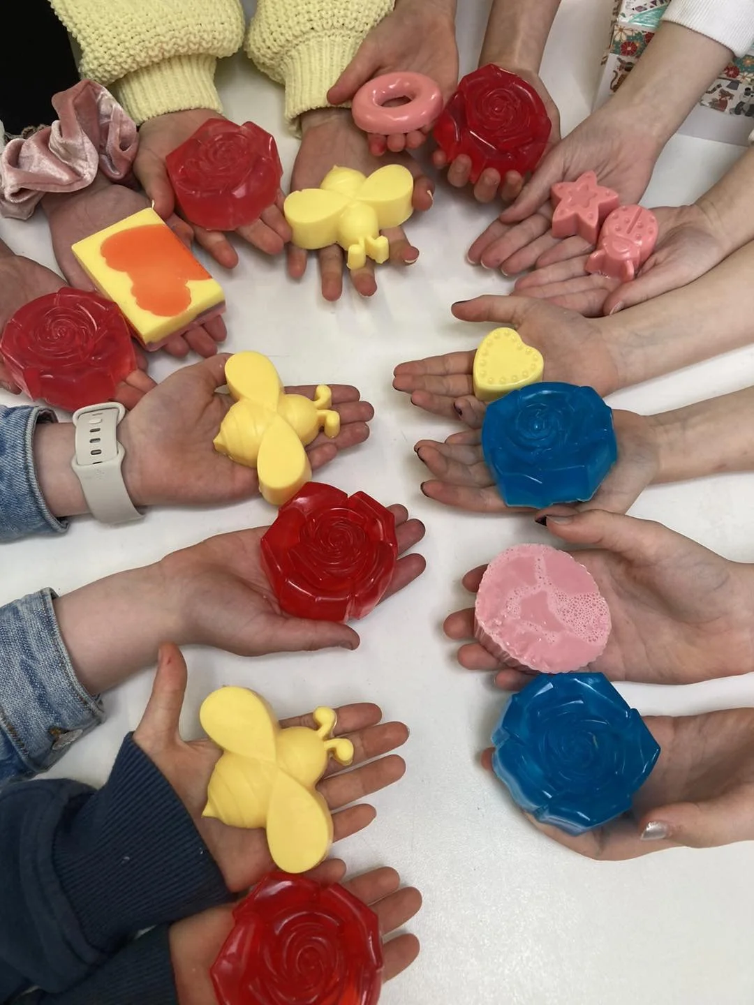 We bring a huge variety of mould shapes – from stars and hearts to animals, flowers, and more. Each child will make between 2 and 4 unique soaps!